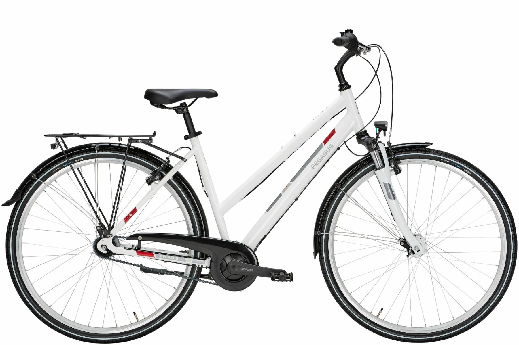 Sieben optimal abgestufte Gänge des Avanti bieten genügend Spielraum für tägliche Fahrten. Für zusätzliche Sicherheit neben den zuverlässigen V-Brakes sorgt die Rücktrittbremse. Komplettiert wird der PEGASUS Klassiker mit einer wertigen Straßenausstattung samt LED-Licht und Nabendynamo.